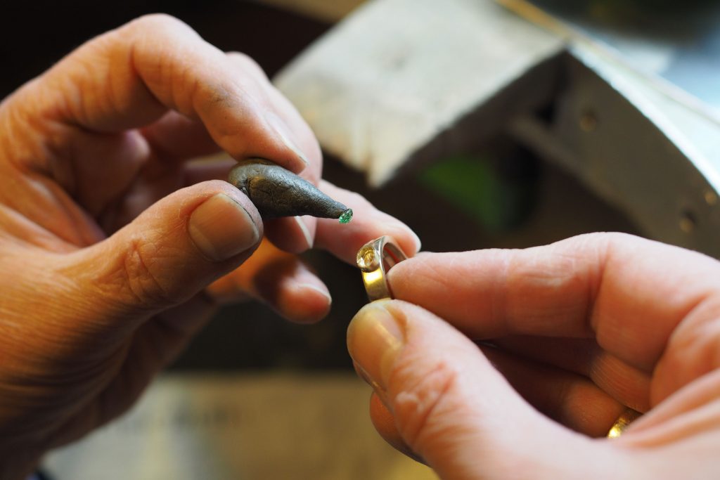 Der Sitz des Steins wird kontrolliert, fertig zum Fassen.