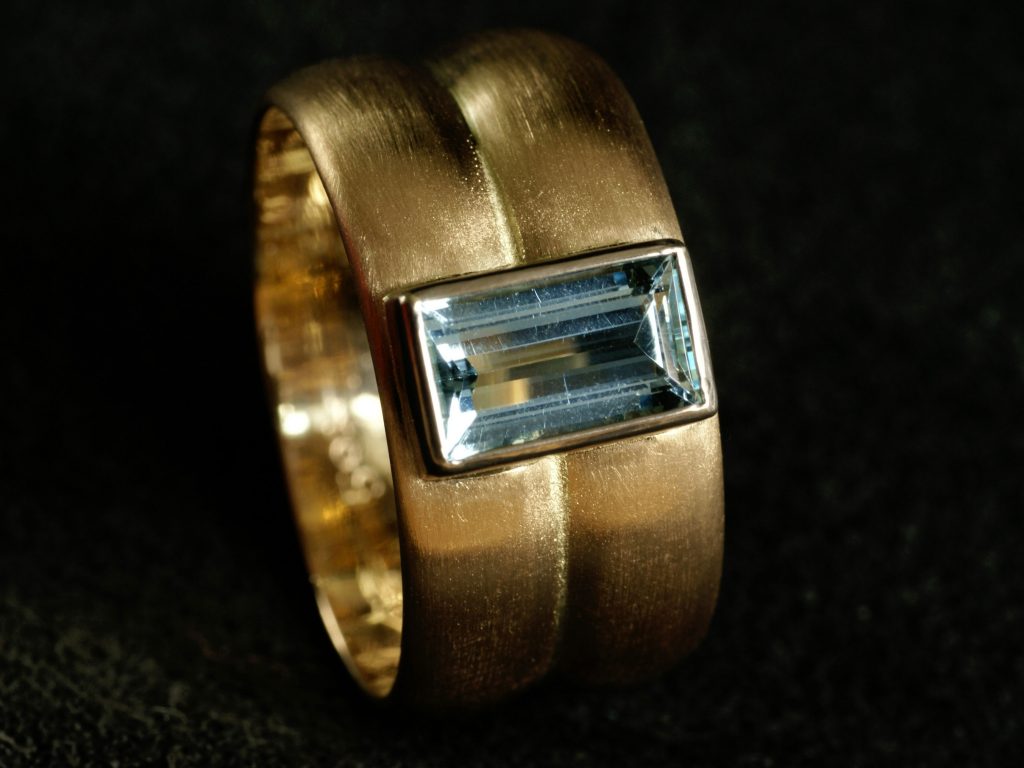 Trauring Umarbeitung, aus zwei mach einen, mit einem viereckigen Aquamarin in einer Weißgoldfassung.