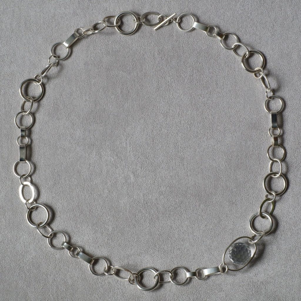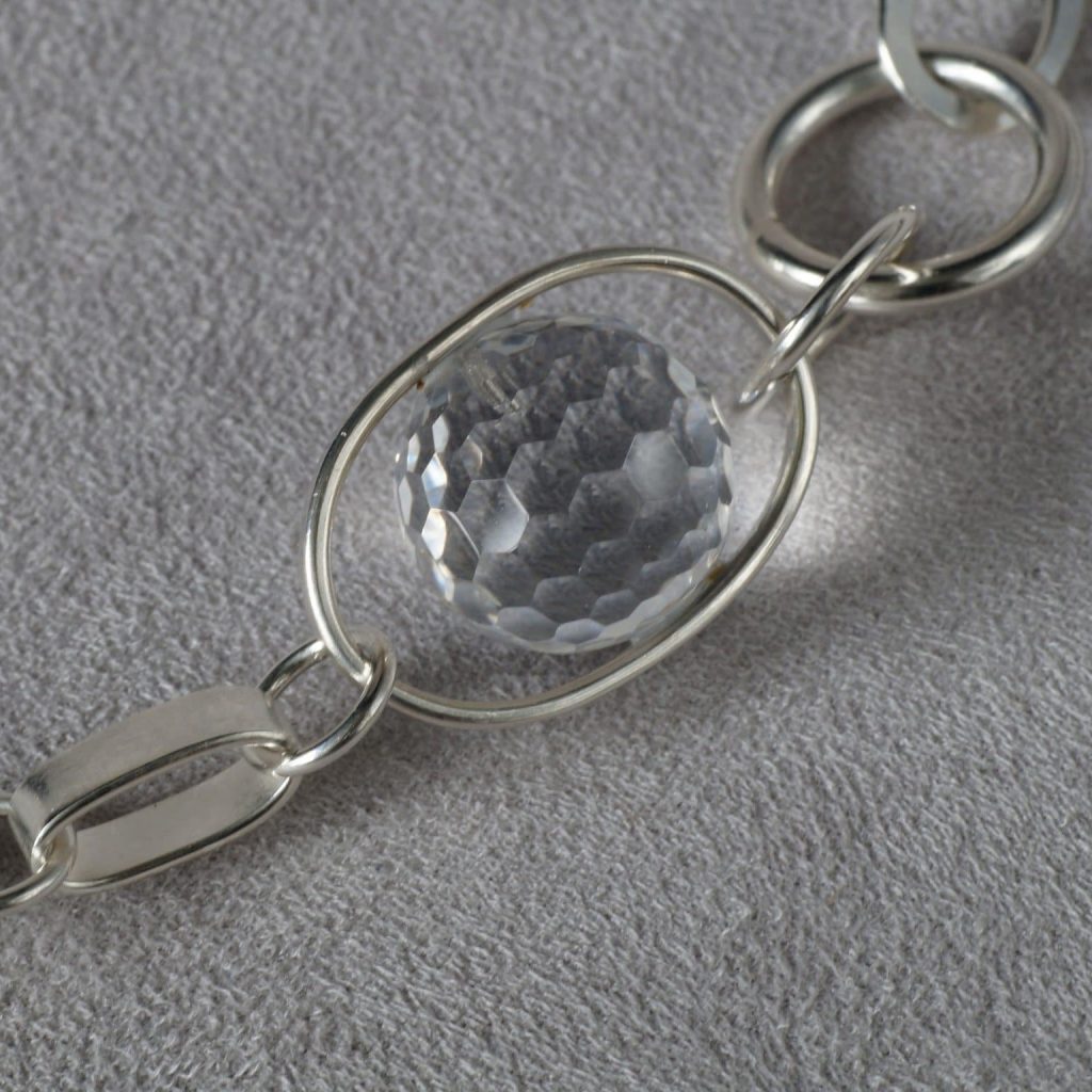 viele verschiedene Silberösen reihen sich aneinander und werden durch eine Bergkristallkugel unterbrochen.