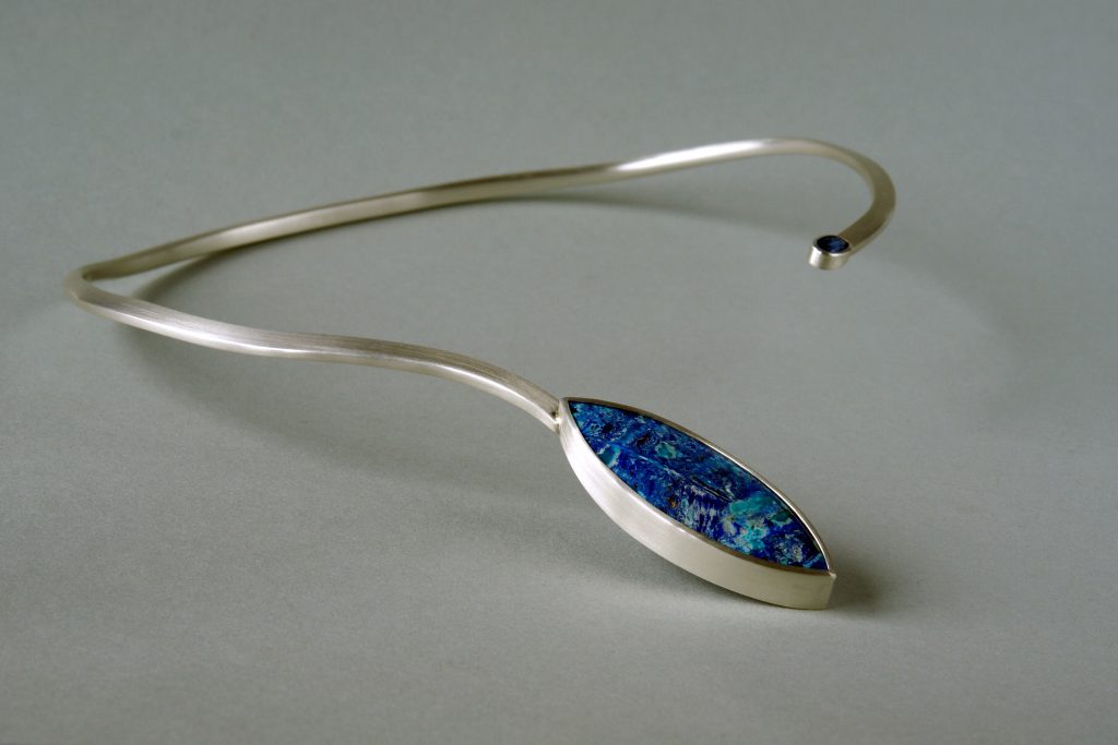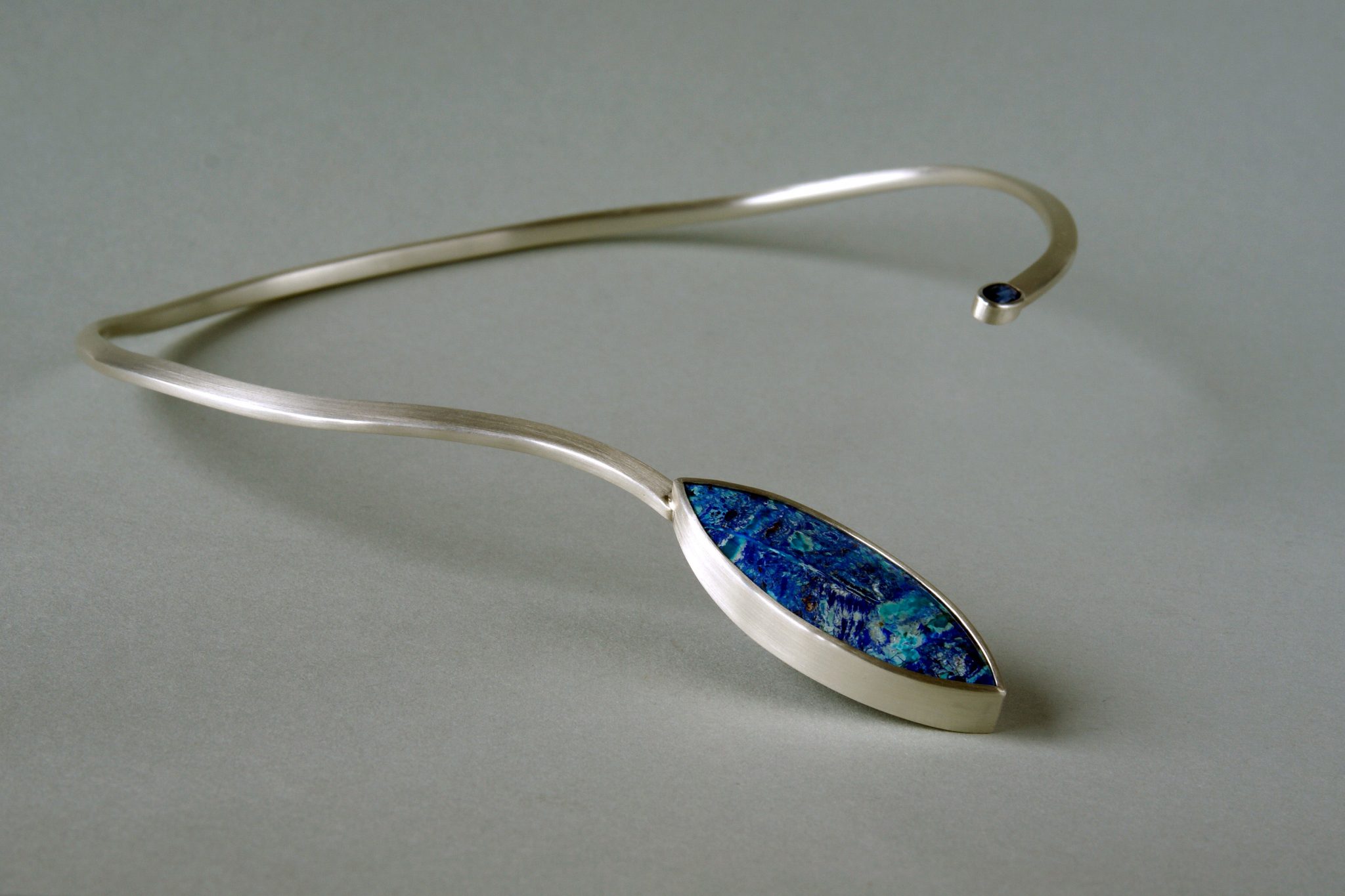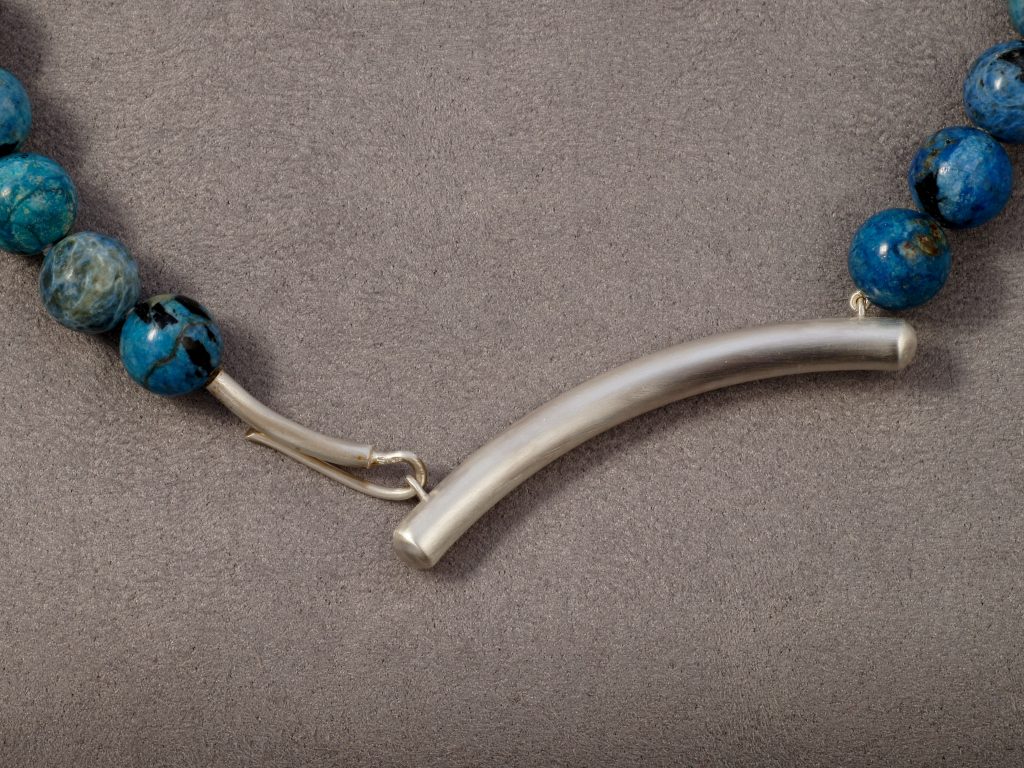 Der Halsreif beginnt mit einem dominanten Stein, dem Azurit und endet als Gegenpol mit einem leuchtenden kleinen blauen Disthen.
