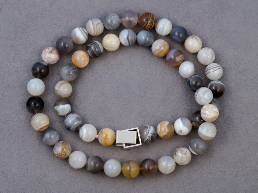kann die klassische Perlenkette, die Edelsteinkette, indem der Stein oder auch der Verschluss im Vordergrund steht, eine reine Silber- oder Goldkette oder auch ein Anhänger sein. Es geht extrovertiert oder zurückgenommen. Für jede Gelegenheit gibt es das passende individuelle Schmuckstück.