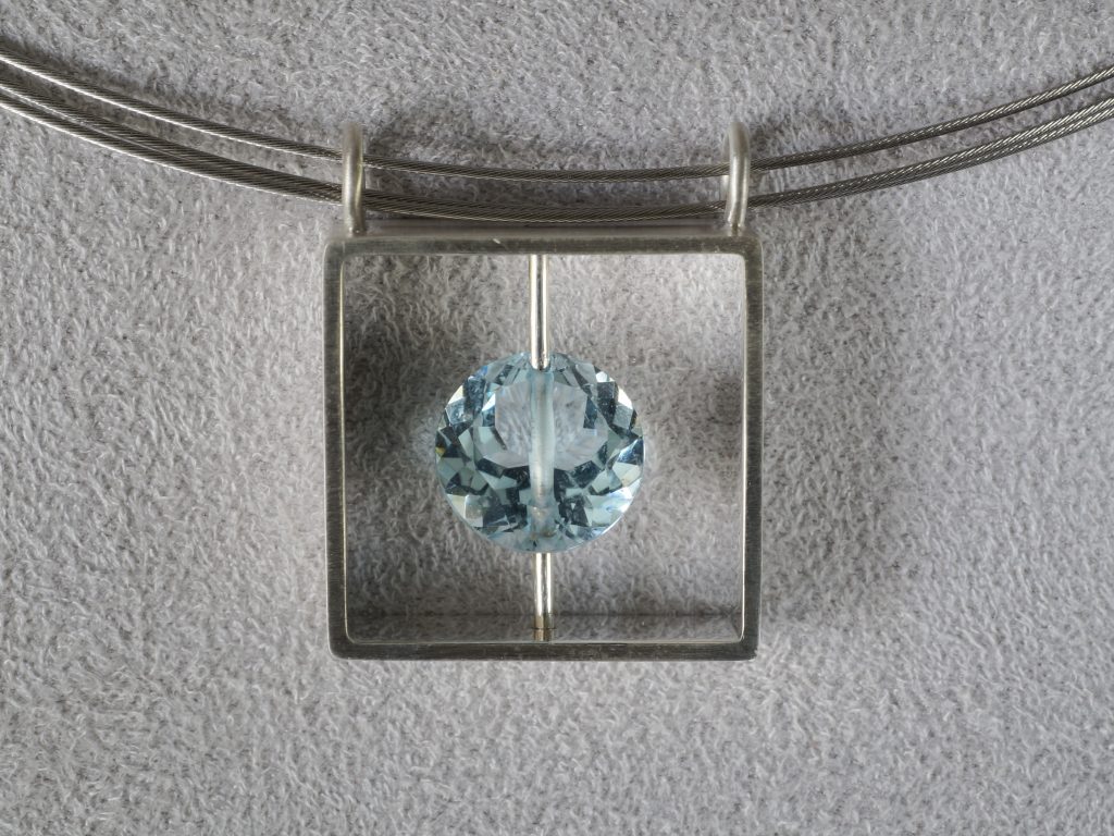 Der schwebende Aquamarin findet durch einen Rahmen seine Begrenzung