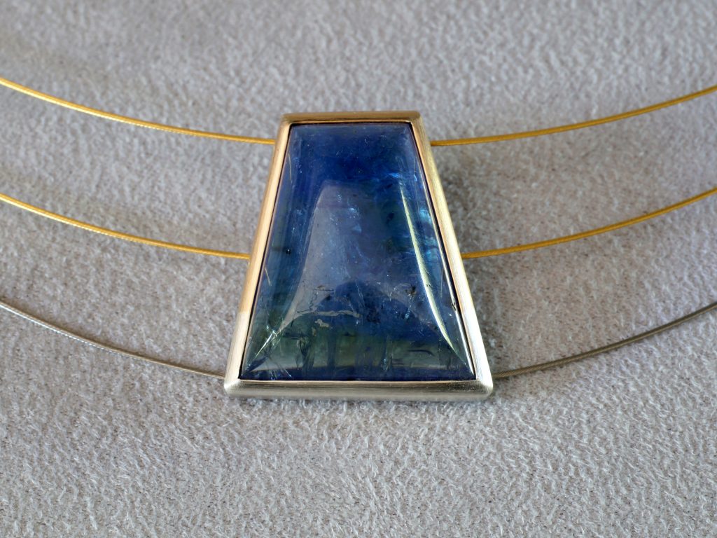 Goldener Anhänger mit Silber und trapezförmigem Tansanit auf Edelstahlhalsreifen