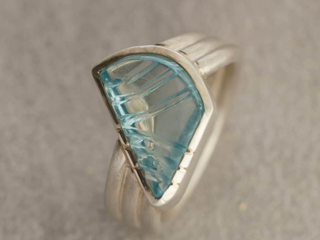 Der Fantasieschliff des Aquamarins setzt sich in der Ringschiene fort.
