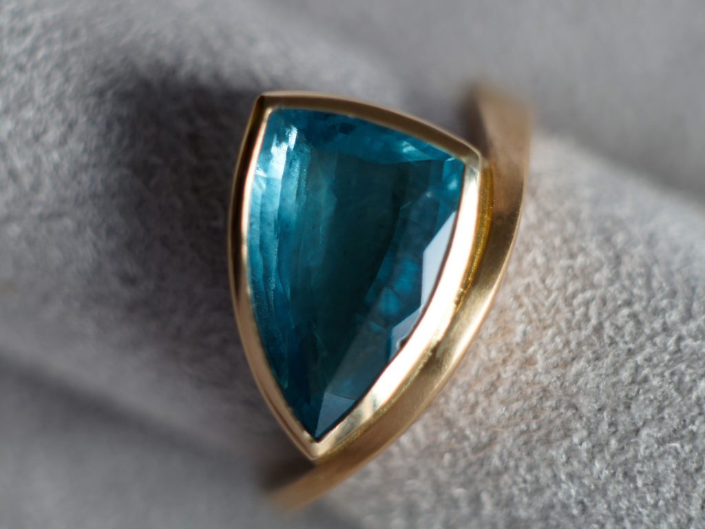 Ein blauer Zirkon wird von einer asymmetrischen Ringschiene gehalten.